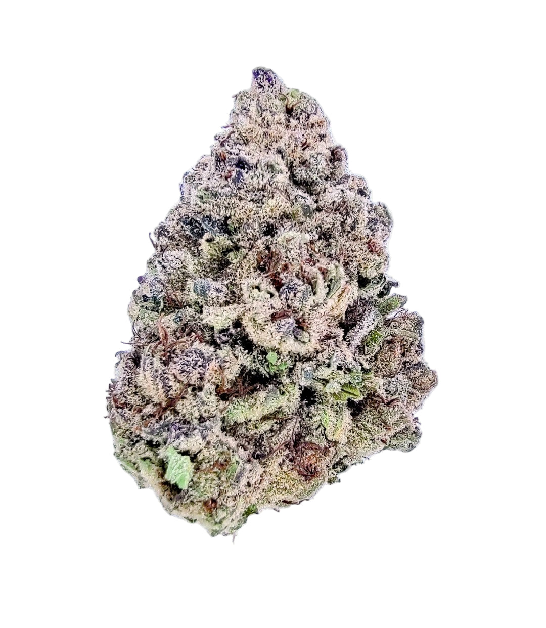 Dense, round buds glow with lavender and violet hues, wrapped in thin orange hairs and a thick frosting of glistening white trichomes. Their candy-shop aesthetic is matched only by their irresistible aroma — sweet, bright, and bursting with joy.